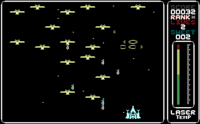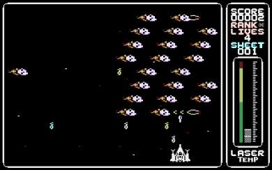 Wie man mit nur 16KB und ohne Sprites ein zu derzeit grafisch anspruchvolles Spiel zaubert, bewiesen Gremlin Graphics bereits 1984 mit "Xargon Wars", einem Weltraumspiel im Stile des Automaten-Klassikers "Space Invaders". In 16 Levels ballert man sich durch verschiedenen Angriffswellen mit teilweise ziemlich zähen Gegnern. Maximal 4 Leben stehen zur Verfügung, die man im Titelbild selbst festlegen kann. Erschwerend kommt hinzu, das sich die Lasertemperatur mit jedem Schuß erhöht, so daß man ein paar Feuerpausen einlegen sollte um keinen Überhitzungsalarm zu riskieren, der bei einer starken Angriffswelle fatal sein kann. |